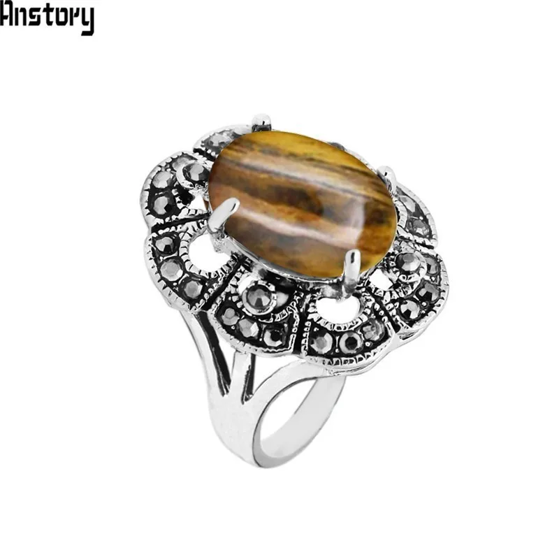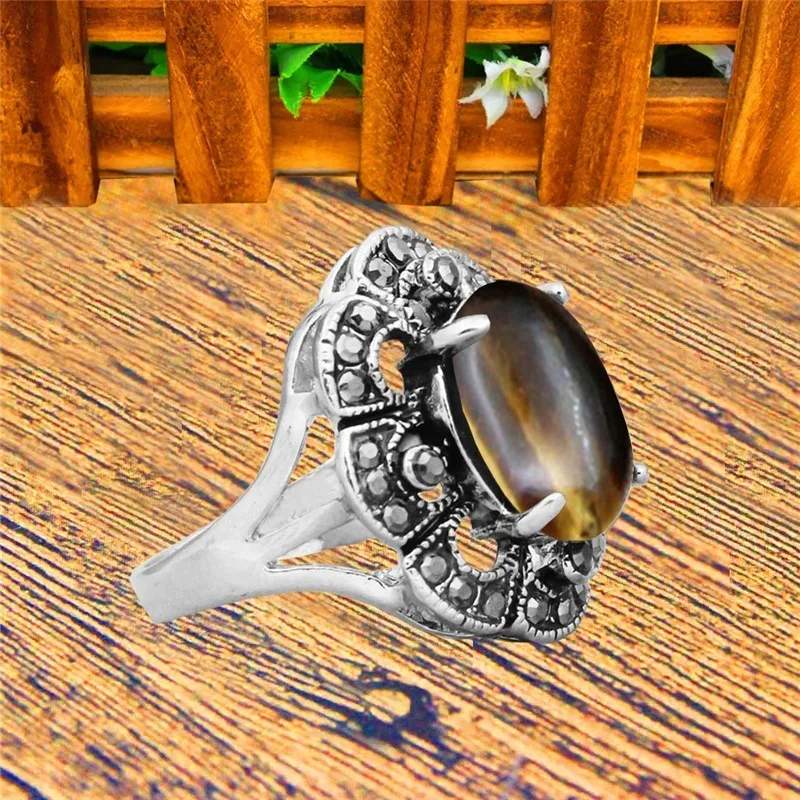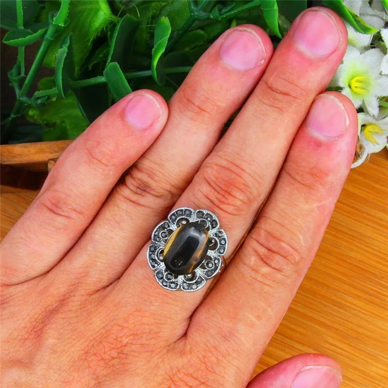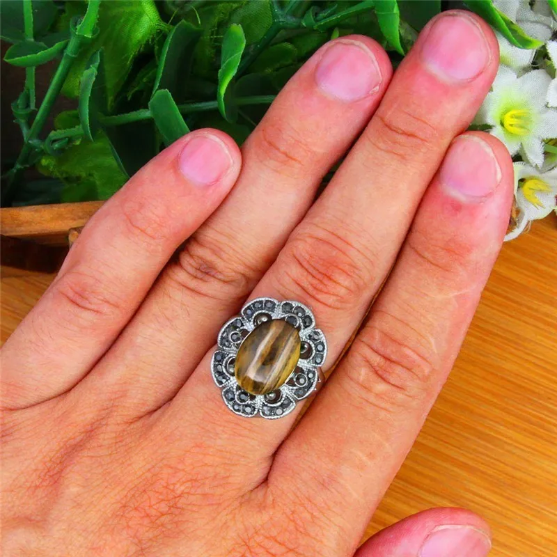 Best Oval Natural Tiger Eye Rings For Women Vintage Look Antique Silver Plated Rhinestone Plum Flower Fa