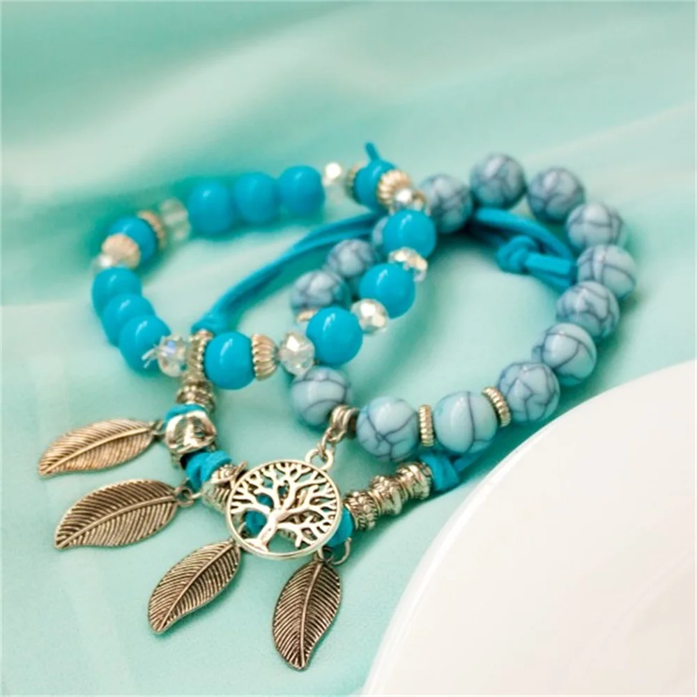 New Classic Tree of Life Bracelet Set For Women Multilayer Natural Stone Vintage Leaf Charms Beads Brac